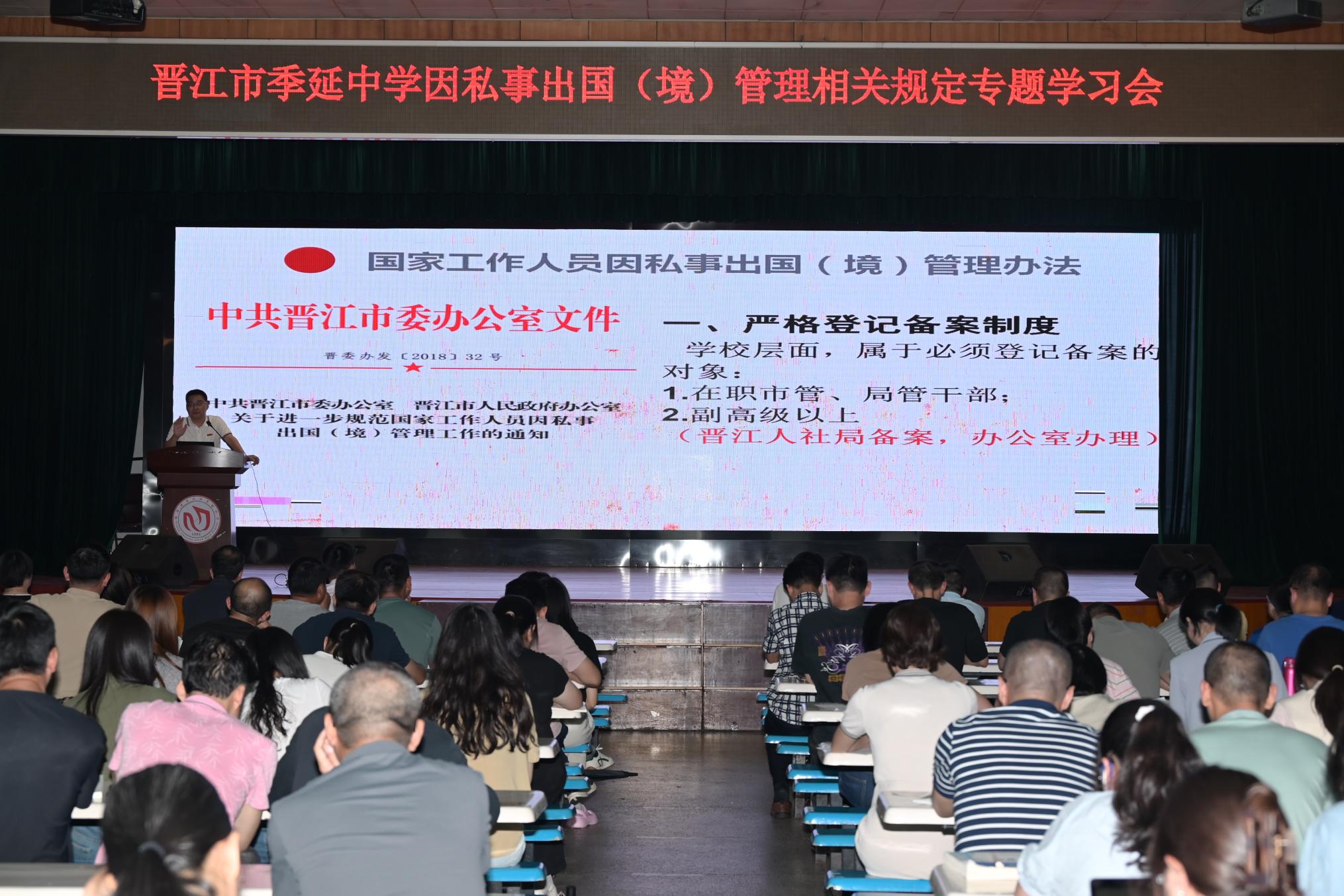 为深入贯彻落实《晋江市教育局关于开展教育系统国家工作人员因私出国(境)管理自查自纠工作的通知》等文件精神,进一步规范全体教师出国(境)管理工作,推动全体教师精准把握出国(境)政策法规,严格遵守国家工作人员出国(境)管理要求,2025年5月6日晚,晋江市季延中学于学校大礼堂召开因私事出国(境)管理相关规定专题学习活动。本次活动由陈文段校长主持,全体教师参与学习。