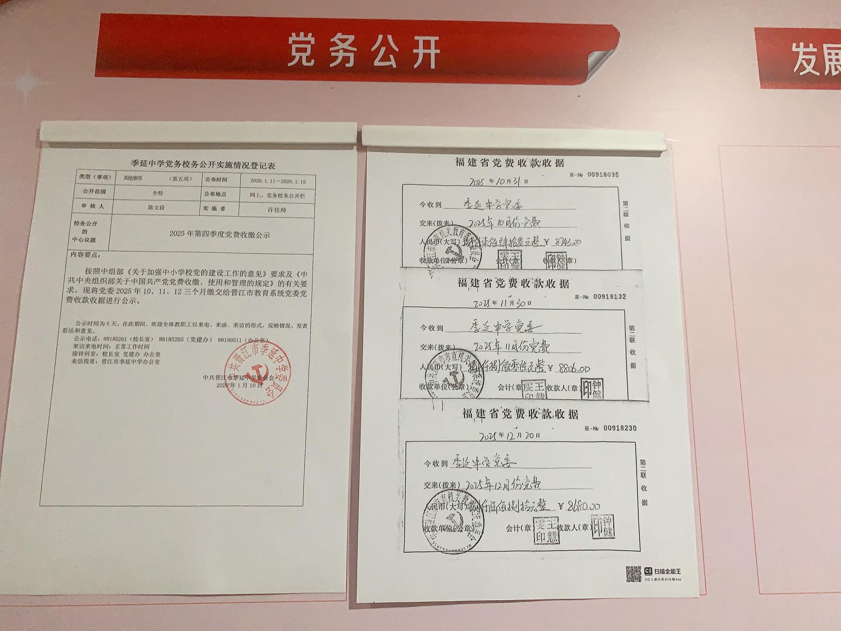 2025年10、11、12三个月缴交给晋江市教育系统党委党费收款收据